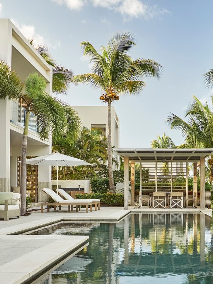 A chic oasis for family and friends, complete with private kitchens, living areas, patios and pools.
