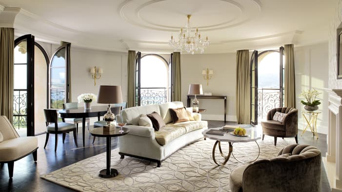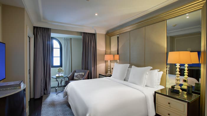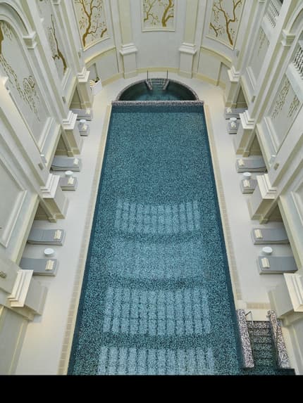 Walk up the lobby’s dramatic curving staircase and you’ll find one of Baku’s most beautiful and ornate ballrooms, reminiscent of classical 18th-century France.