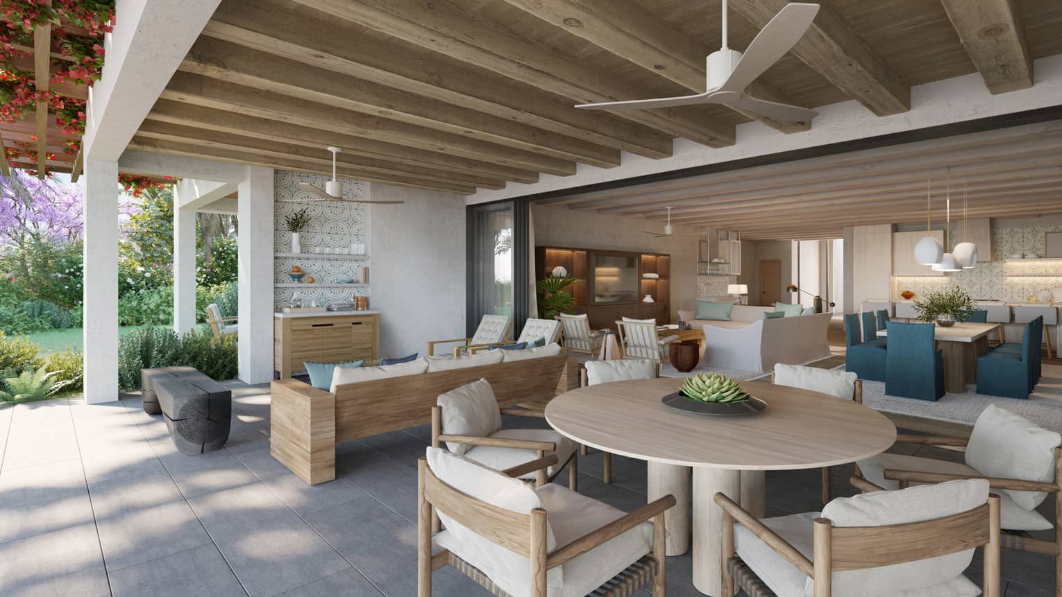 Perched above the Resort and the exclusive Cove Club Golf Course with sweeping ocean views, this six-bedroom estate home features modern Mexican architecture.