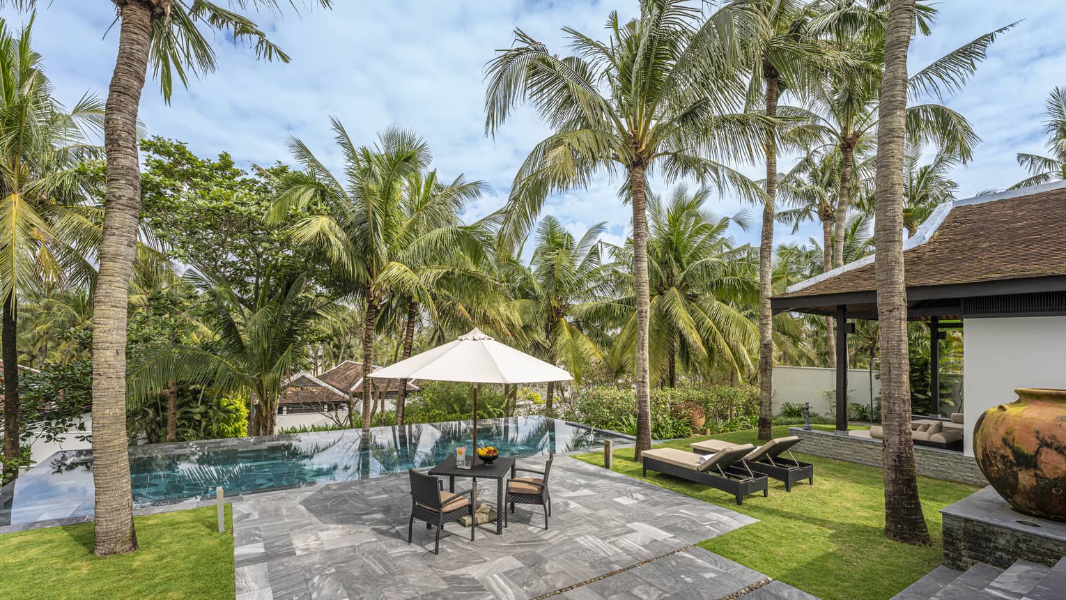 Slip into your private pool, linger under the outdoor rain shower and share gourmet meals at the pitched-roof pavilion.