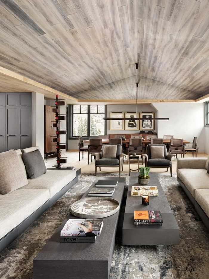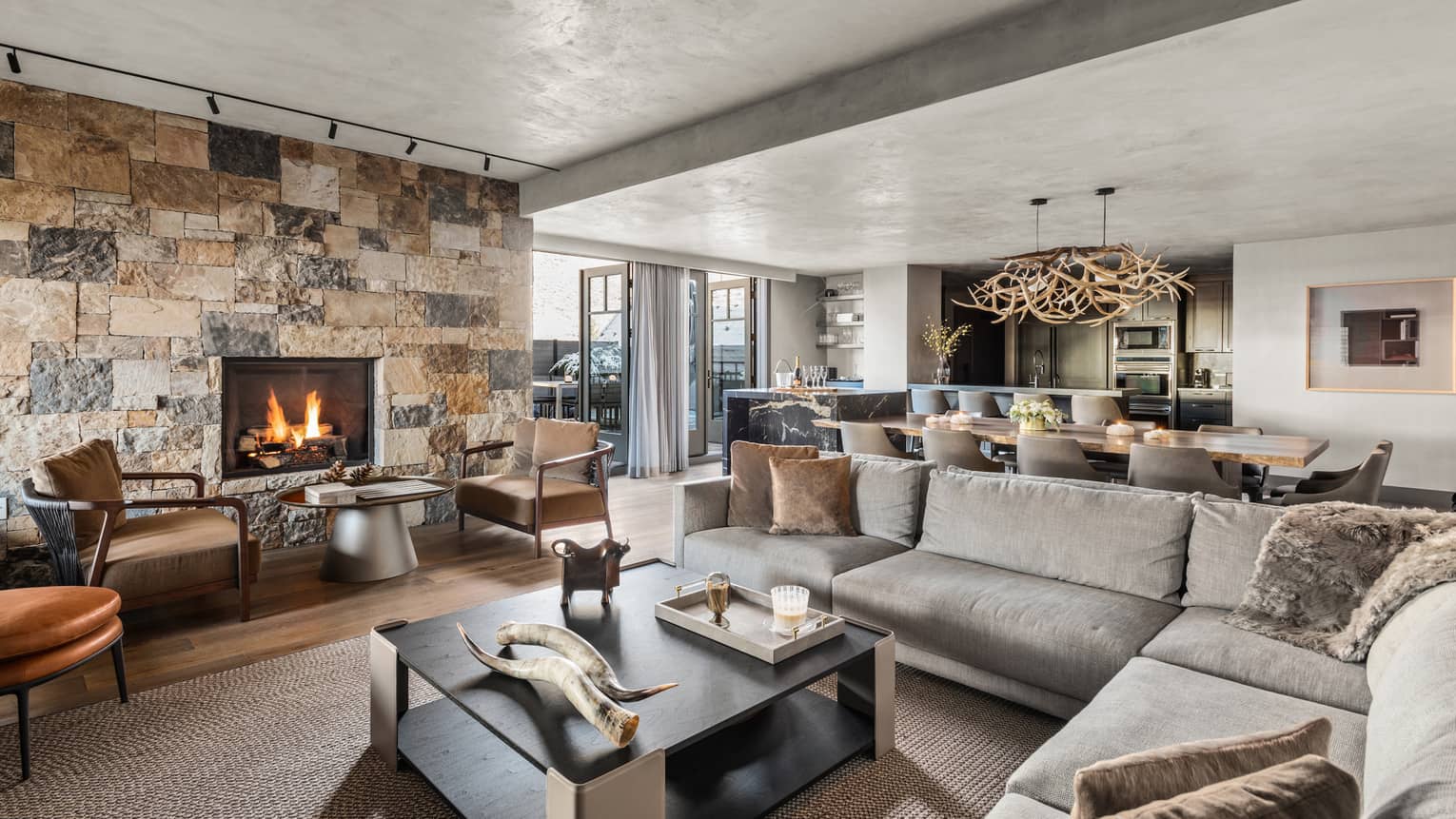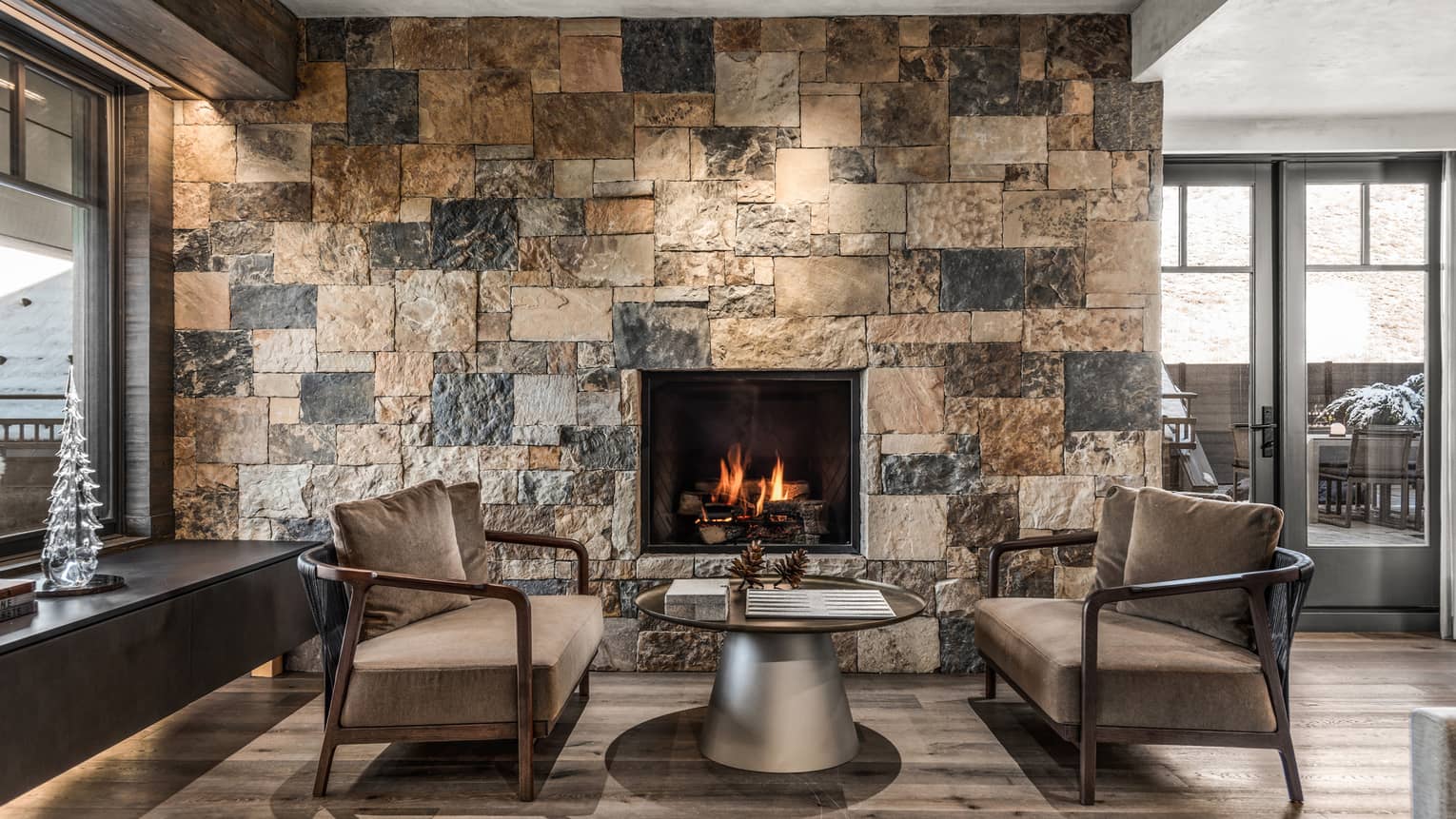 This contemporary, alpine-inspired residence integrates local stonework with an open-space design spanning from the kitchen through the main dining area into the living room.