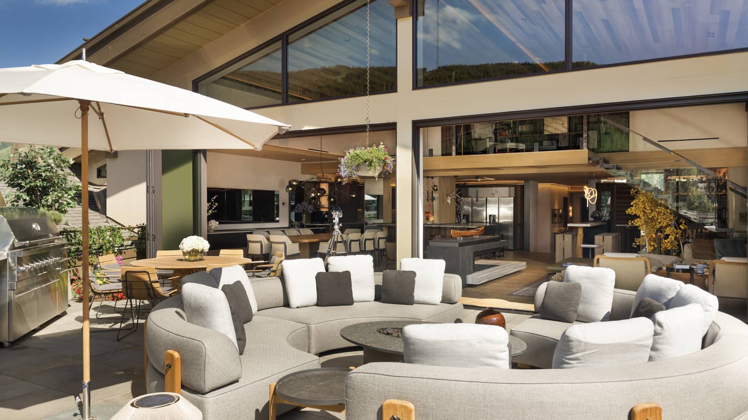 A luxurious living space for families and groups with a large terrace, steam showers and media room.