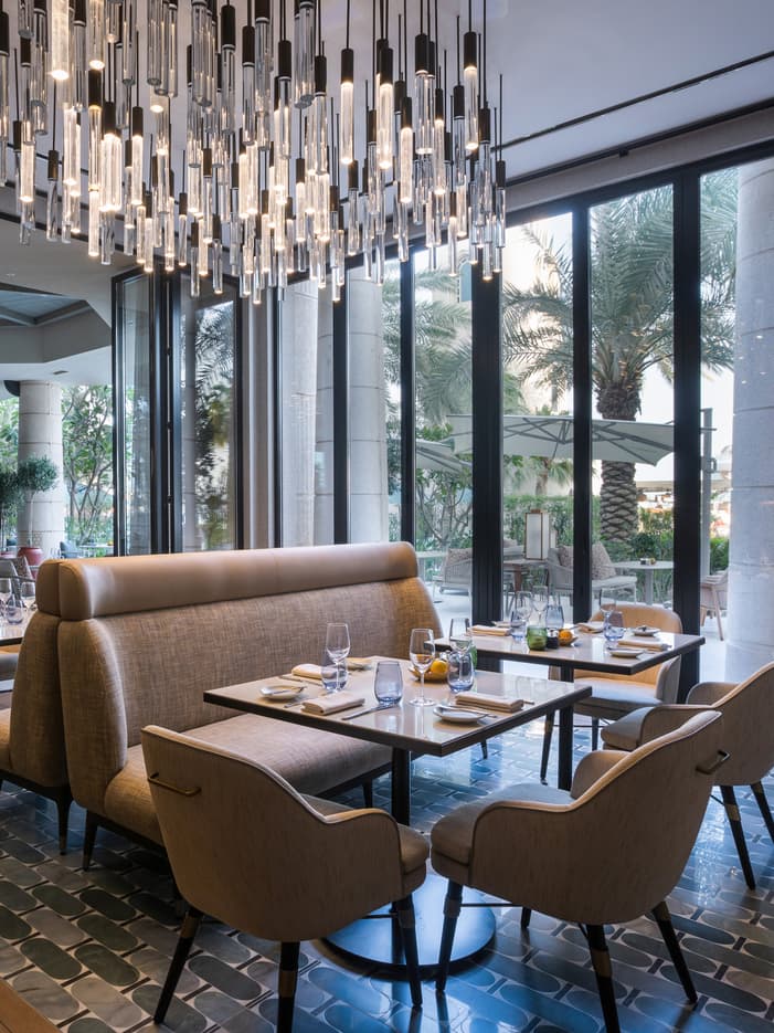 Enjoy the endless blues of the Arabian Gulf in our glass-walled dining room. Savour tempting Arabic mezze and international favourites, paired with craft beverages and a wide array of shisha flavours.