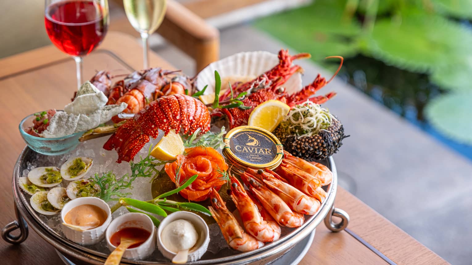 Sunday brunch chilled seafood platterPoached Lobster, Tiger Prawns, Crayfish and Scallop Crudo, Line-Caught Tuna Tartare, Coffee Wood–Smoked Salmon, Steamed Clams, Lombok Seaweed