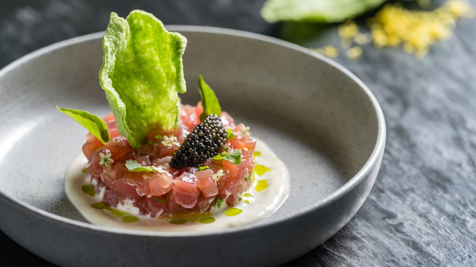 Line-Caught Tuna TartareSturia Vintage Caviar, Smoked Cream, Lemon Basil Kerupuk