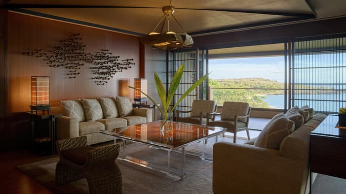Bespoke furnishings and elegant artwork fill this lavish, two-bedroom suite, whose updated, mid-century style makes the open-concept living and dining space, a formal sitting area, a media room, a library, three open-air lanais and generous bedrooms feel like a luxury island home.