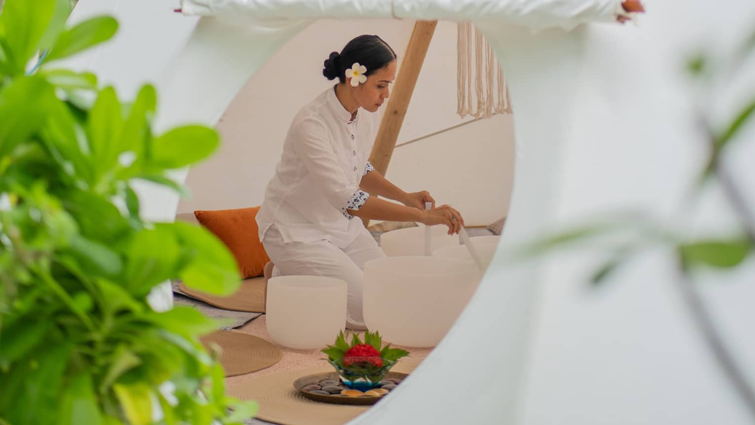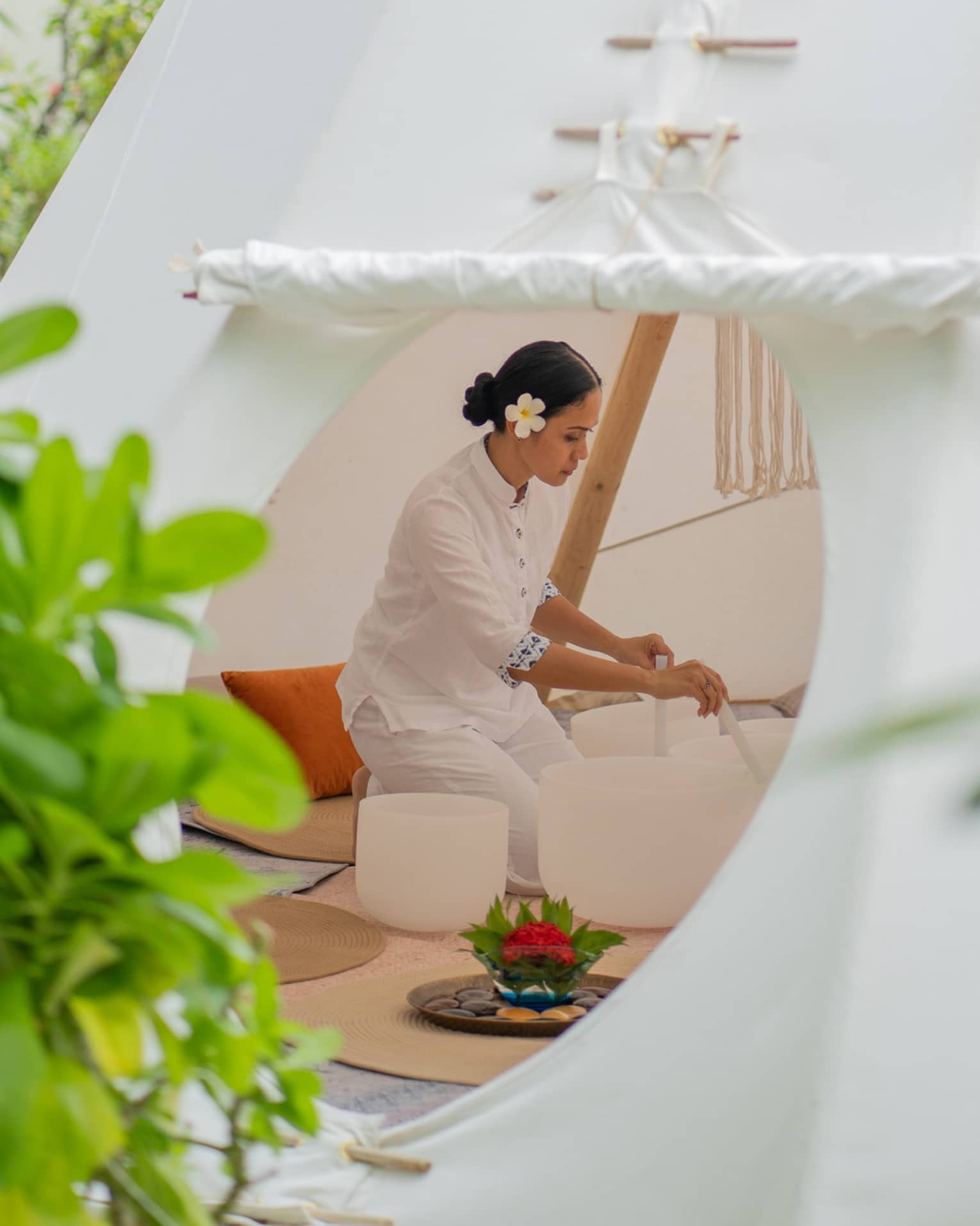Immerse yourself in the cocooning embrace of our 5.5-metre (18-foot) healing tent – a nurturing space for intimate connection with nature, ancestral knowledge and your own core being.4 / 4