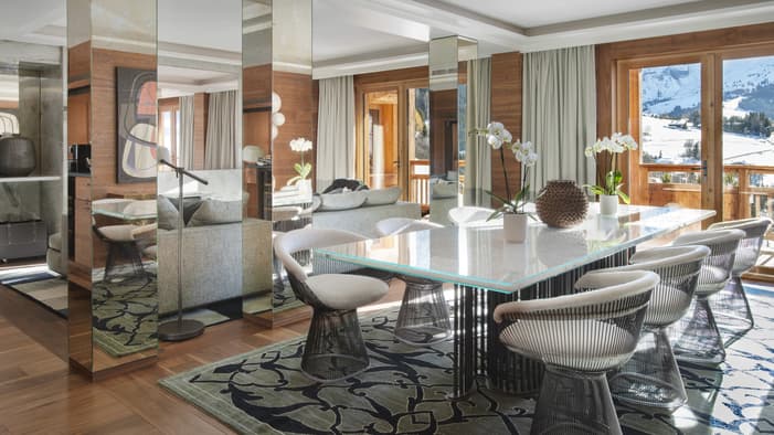 A night in Suite Idéal – the highest accommodation in Megève – gives you first access to fresh morning snow, dramatic views of the Mont Blanc and Aravis mountain ranges, and a tailored dinner prepared by our Chef.1 / 3