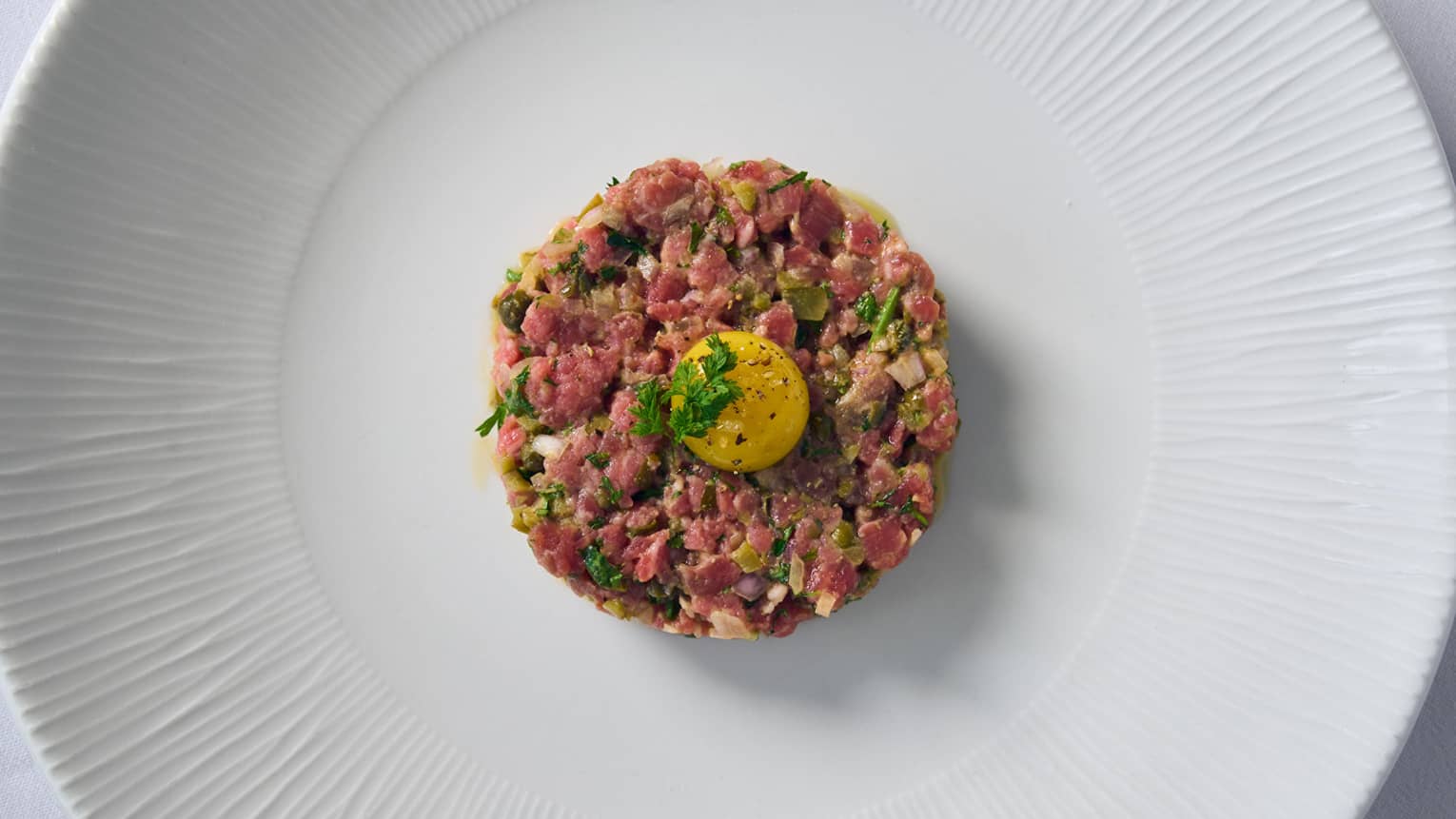 Beef tartareBlack Angus Beef, Capers, Shallots, Parsley, Cornichon, Quail Egg, Melba Toast