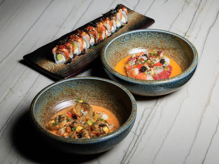 Chirashi CevicheSalmon, tuna, octopus and scallop with ikura, caviar and sushi rice, dressed in aji amarillo and leche de tigre. A Nikkei-style dish from our Peruvian-Japanese restaurant in Miami.