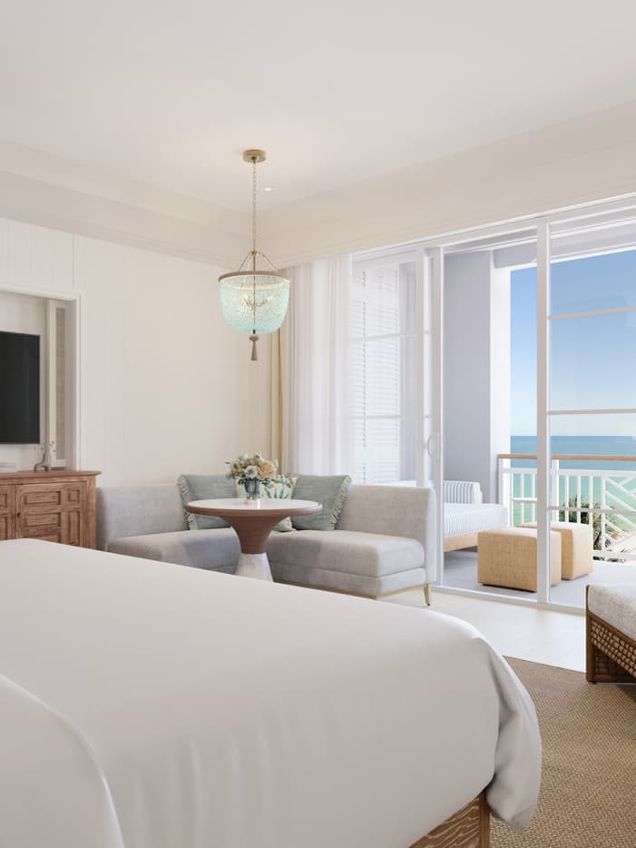 Unobstructed views of the Gulf greet you the moment you enter this spacious guest room, elevated on a higher floor. Step onto the expansive furnished terrace to see the pools and beach below. Experience the ultimate in modern coastal luxury – from the elegant white-marble bathroom to the famously comfortable Four Seasons bed.