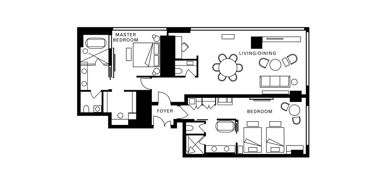 Expansive spaces for living and dining offer inspiring possibilities: savour sunlit family brunches with a view or host intimate cocktails for friends. The thoughtful layout ensures privacy for both bedrooms, ideal for families with older kids or couples travelling together. Spa-style bathrooms add a splash of extra indulgence.