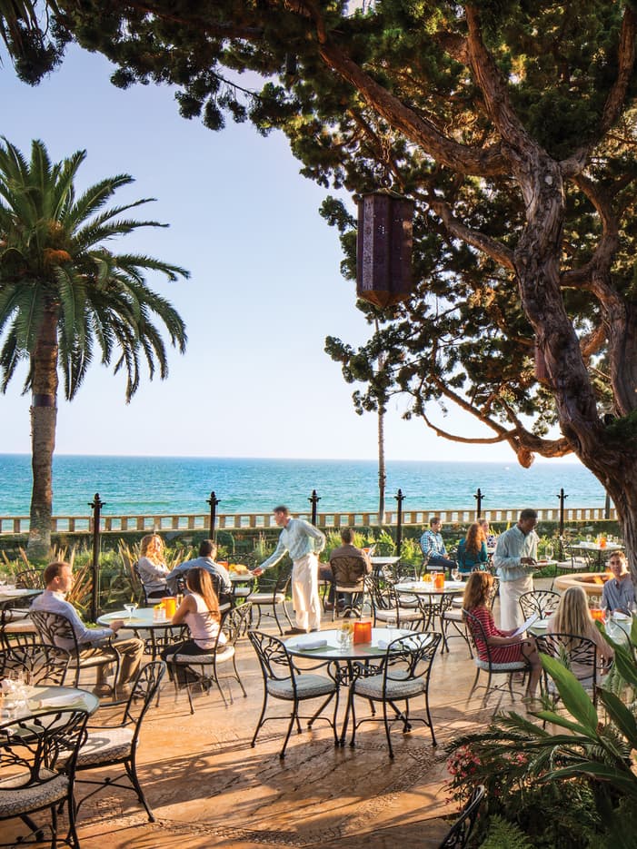 Dimly lit with glowing Italian onyx and massive hand-blown glass chandeliers, our sultry, Spanish Colonial-style lounge invites you in for tapas, classic cocktails and local wines best enjoyed inside by the fireplace or out on the ocean-view terrace, gathered with friends both old and new.