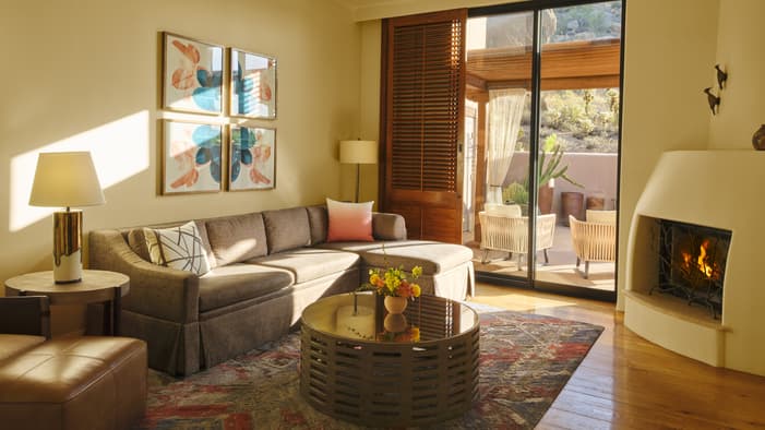 This expansive two-bedroom, two-bathroom suite offers the perfect blend of comfort and privacy, ideal for families or two couples. A spacious main living room opens onto a large sun-drenched patio, complete with a private spa pool and outdoor chiminea – perfect for relaxed evenings under the Sonoran sky. Inside, enjoy gas-burning fireplaces in each bedroom and the common area, along with a fully equipped kitchen designed for effortless entertaining.