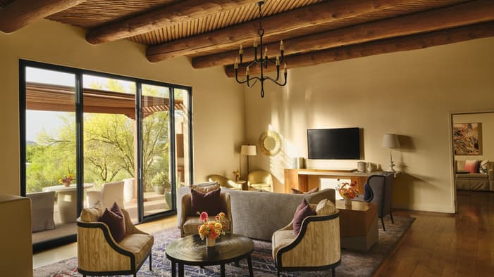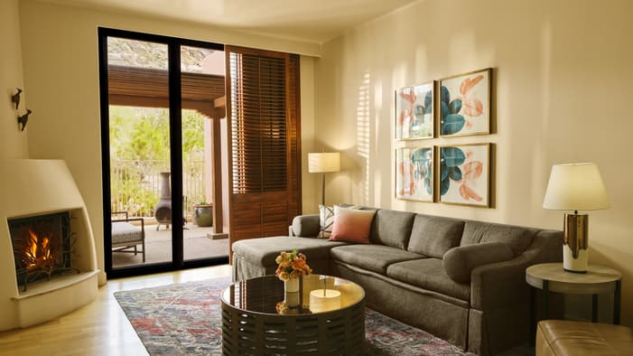 With a sun-filled living room, plentiful outdoor seating and a heated plunge pool, these suites are ideal for families or two couples. Enjoy Scottsdale’s more than 330 days of sunshine with expansive patios, perfect for gathering together for al fresco drinks at sunset. Enjoy interior gas-burning fireplaces in each bedroom and the common area, as well as fully equipped service kitchens to make entertaining a breeze.