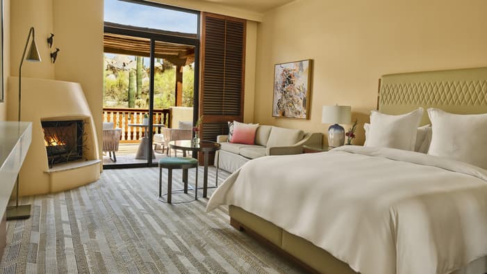 Step in from your private patio or balcony overlooking the Sonoran Desert and relax in this spacious guest room, designed to make you feel at home with a gas-burning fireplace. A newly enhanced bathroom features a deep soaking tub and luxurious separate shower.