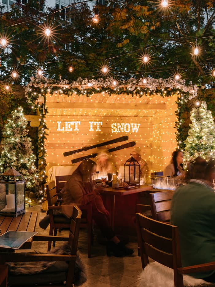 Cozy Semi-Private Chalets — Your Perfect Holiday RetreatIdeal for families and groups of four to six, our semi-private chalets at Après Village offer a warm and inviting space to enjoy the season. Each chalet is thoughtfully designed with plush blankets, soft pillows and a cozy fireplace. Enjoy holiday movies on a flat-screen TV, featuring a new festive film every weekend, creating the perfect ambiance for memorable gatherings. Chalets are available by reservation only, with a rental fee and a 90-minute seating limit, ensuring an intimate and exclusive holiday experience.