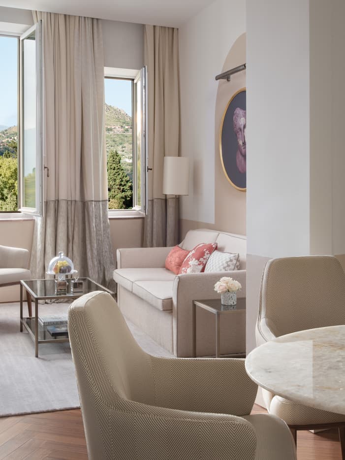 Our luxury Hotel enjoys panoramic views of Mount Etna, the sea and the coastline with our eponymous Etna Suite. Entertain in the spacious living room elegantly appointed with contemporary décor.