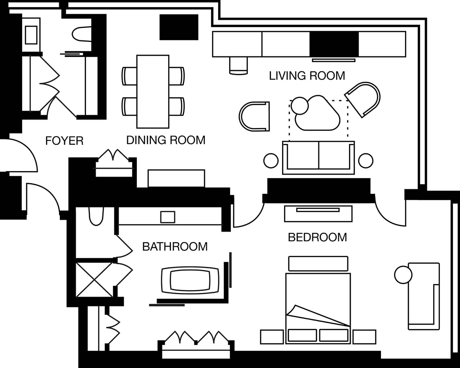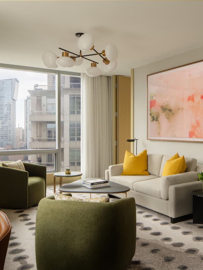 Corner locations lend the Yorkville Suite its chic, city-apartment feel. Settle in to the expansive living area, lounge seating and a modern dining space.