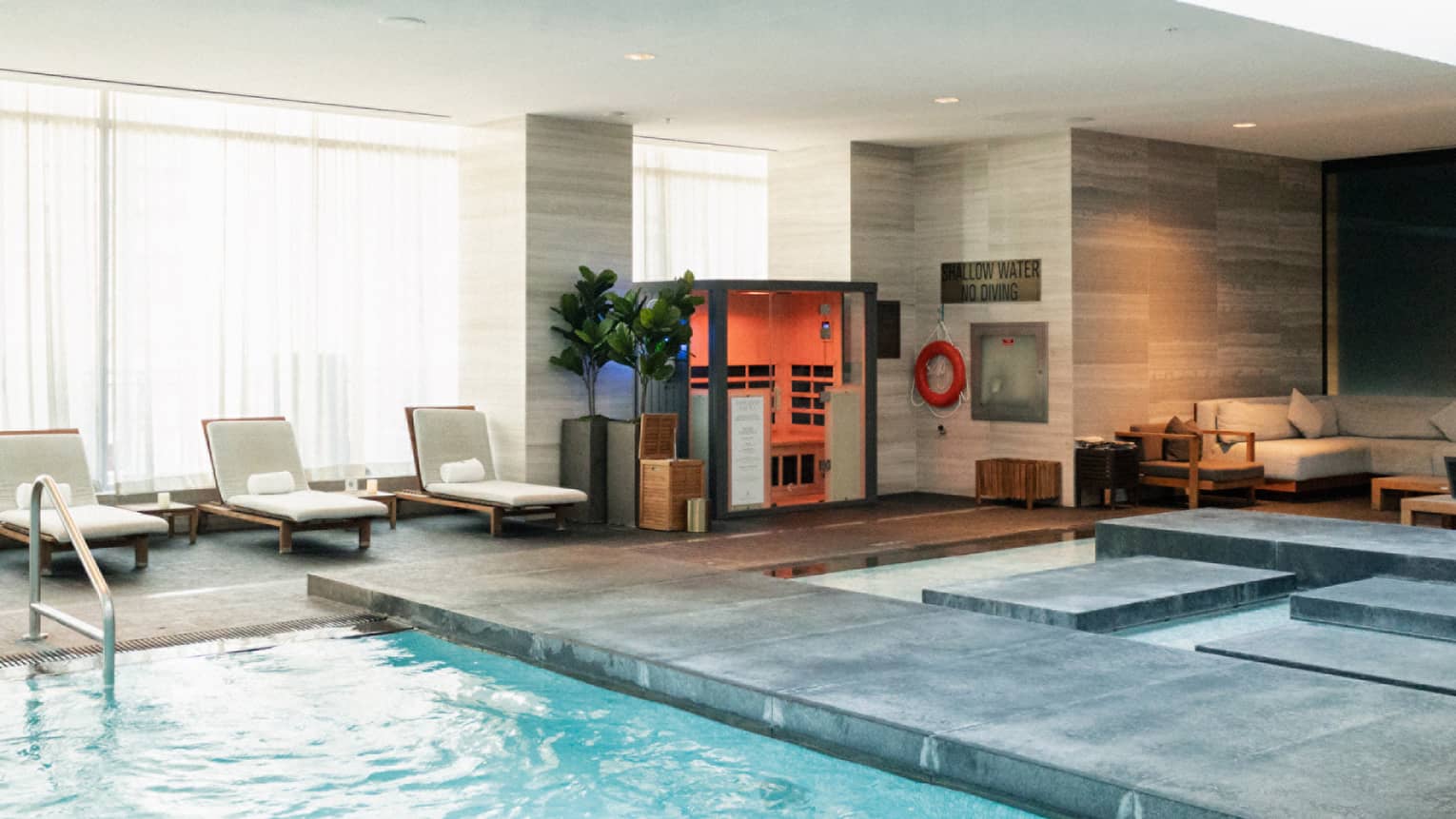 Reinvigorate in Our Relaxation PoolEscape to the sanctity of our indoor relaxation pool and hot tub, open daily from 6:00 am to 9:00 pm. Please note this is a shared space for residents, hotel and spa guests. Family changing rooms are available on the pool deck.