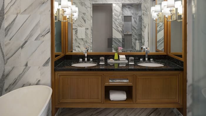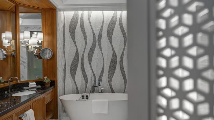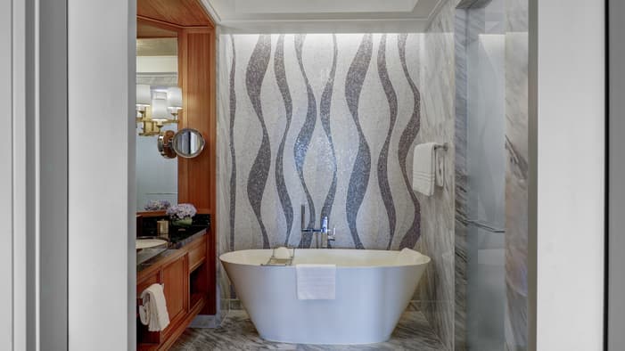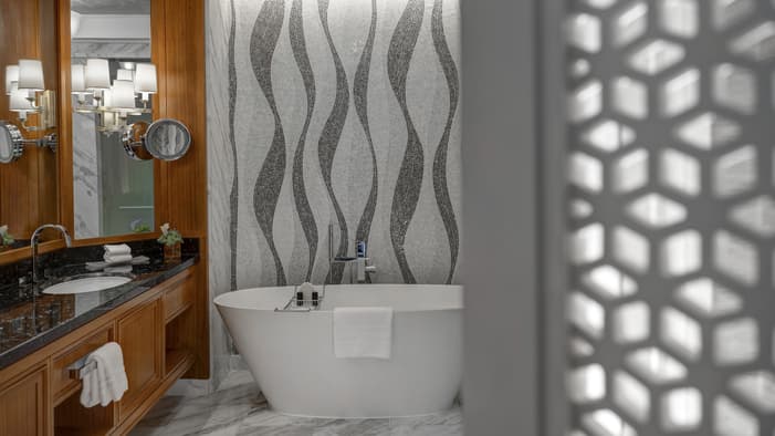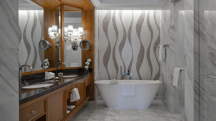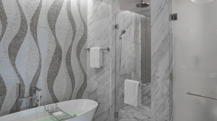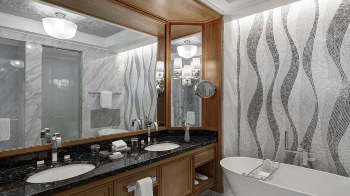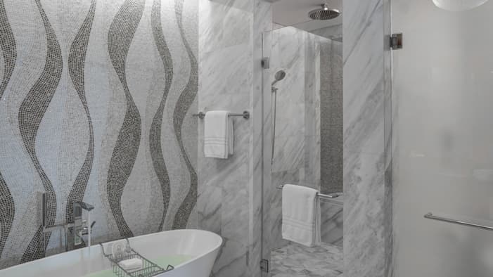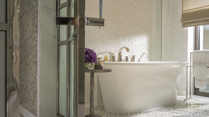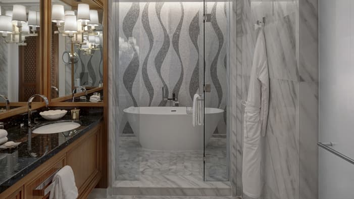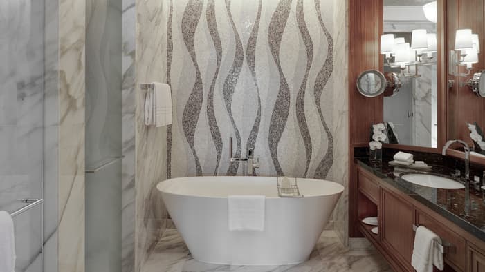 تتميز حماماتنا البراقة بجدرانها المُرصعة ببلاطات الفسيفساء الساحرة التي تعتبر بمثابة خلفية دراماتيكية لحوض استحمام فاخر.