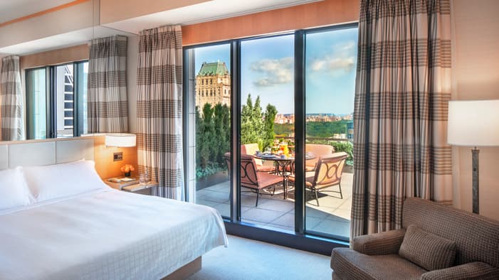 Opening up onto private landscaped terraces with dramatic park and city views, these luxurious and well-appointed Suites feature Italian marble bathrooms and spacious living and sleeping areas.