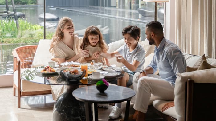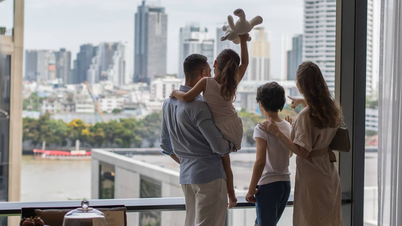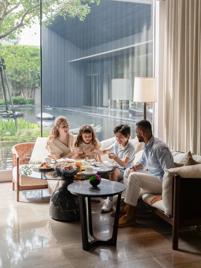 Enjoy spacious suite living as a family with Chao Phraya River or Palm Court views.