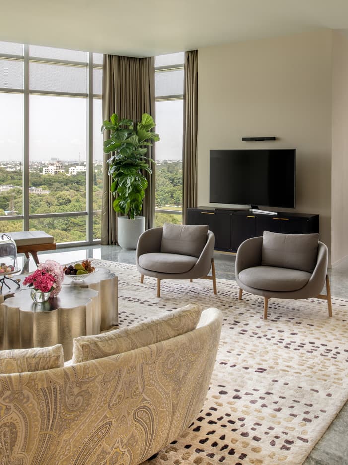 Elevate your stay with sky-high views of lush treetops and cityscapes from this prestigious suite on the 20th floor. Bathed in abundant natural light, the contemporary interiors feature a study, private gym, walk-in closet, kitchenette and guest powder room. Host intimate gatherings across the elegant living and dining area, complemented by a Four Seasons personal attendant service. Bengaluru’s definitive VIP accommodation is designed to the highest residential standard.