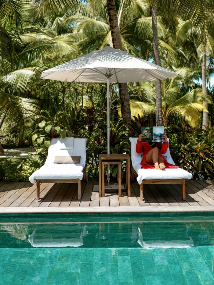 Our Two-Bedroom Poerava Overwater Bungalow Suite with Plunge Pool is designed for living, entertaining and soaking up panoramic views from a vast private deck with lagoon access.