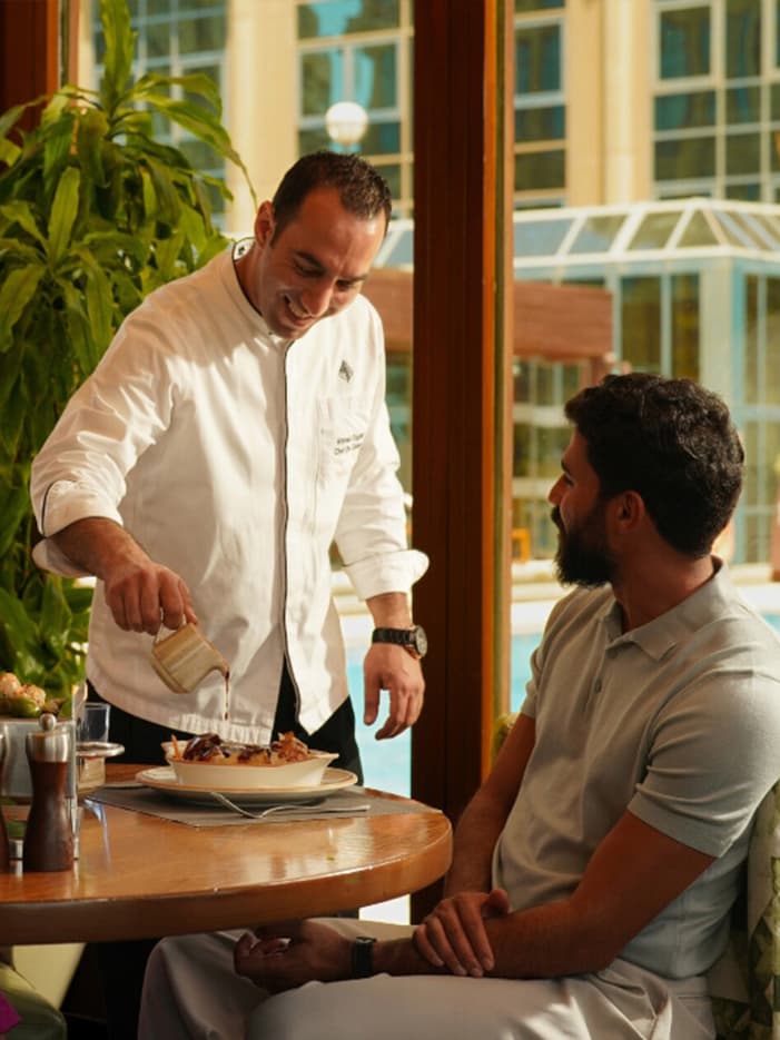 Warmed by Egypt’s golden sun and Lebanon’s soulful spirit, savour a late Tarwiquh-style breakfast by the pool at Aura. Flaky hand-stretched Egyptian feteer, drizzled with treacle and tahini is paired with grilled halloumi, manakish, fava beans and crisp falafel. Each dish, crafted by Lebanese chef Ahmed Al-Zoghbi, is reminiscent of his childhood flavours and carries the timeless magic of sharing cherished moments.
