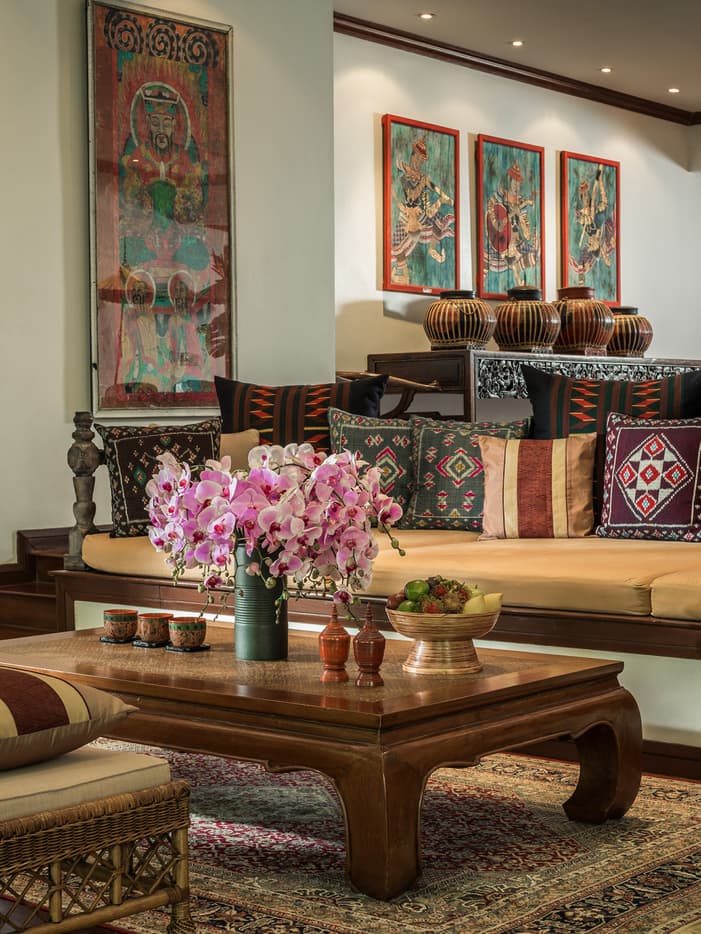 Rich silk and cotton furnishings, beautiful Siamese artifacts and original paintings.