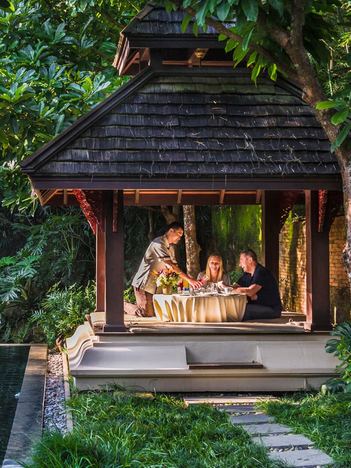 Start the morning with a Champagne breakfast in the privacy of your guest room, enjoy a few hours pedalling around the Resort and the Mae Rim Valley on provided bicycles, relax all afternoon at the Spa, and greet the night with a candlelit dinner overlooking the rice fields. Or let us arrange an itinerary that's uniquely you.