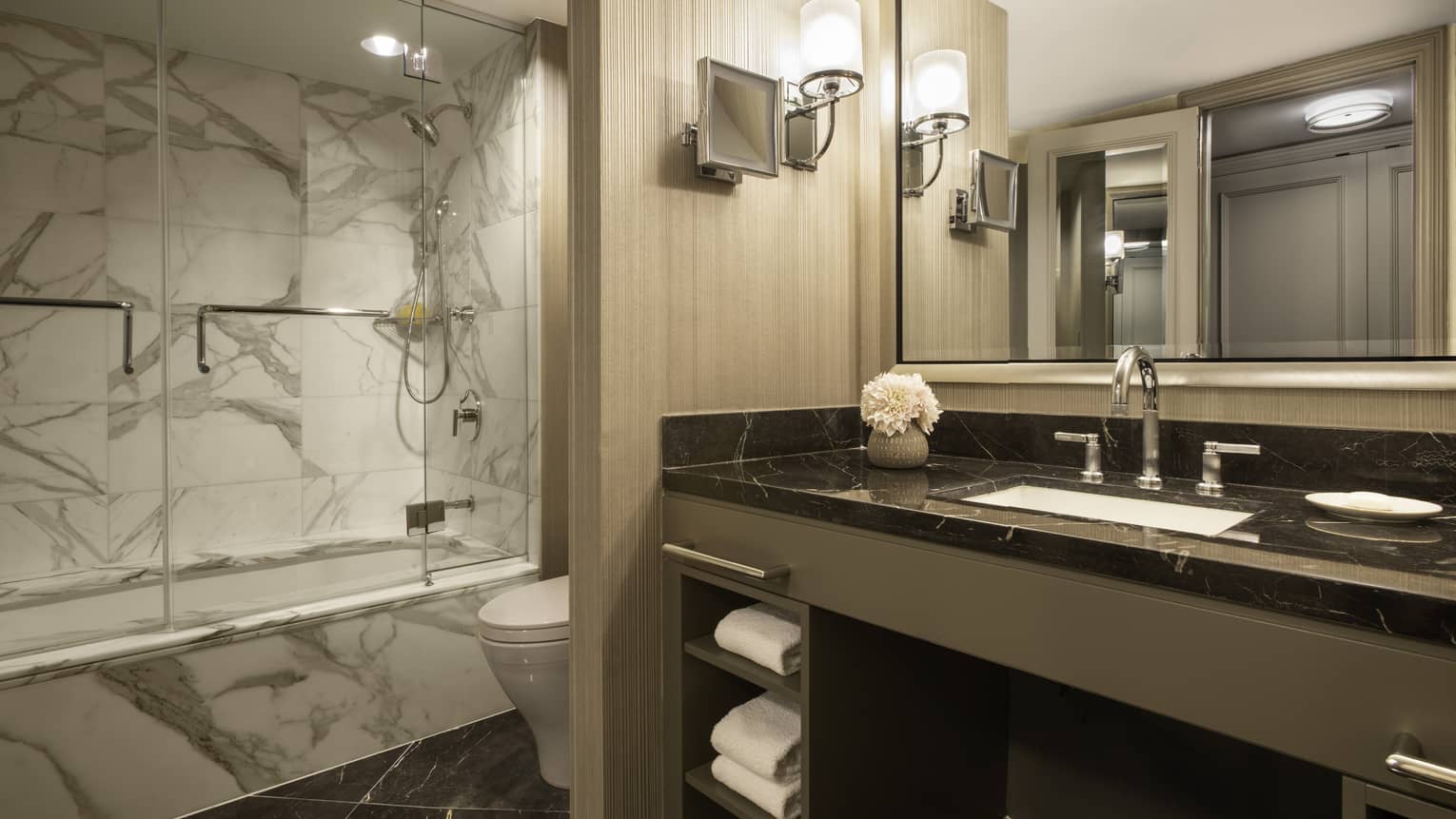One full marble bathroom, plus guest powder room