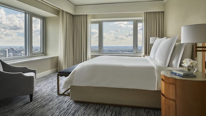 Icy greys, midnight blues and snowy whites are accented by grained wood and stone to perfectly complement Denver's skyline and the panoramic views of the Rockies seen from the oversized windows in these upper-floor rooms.