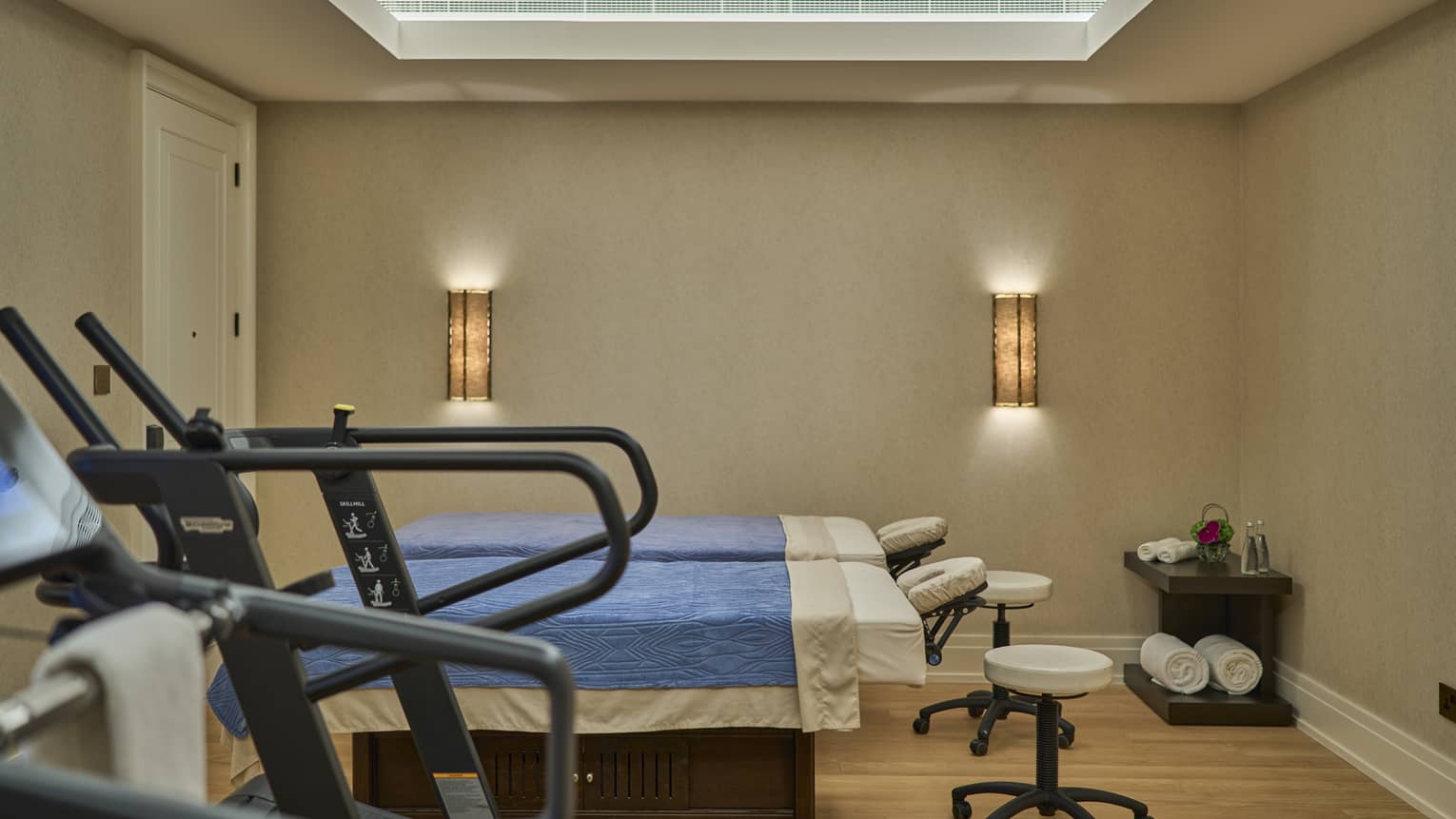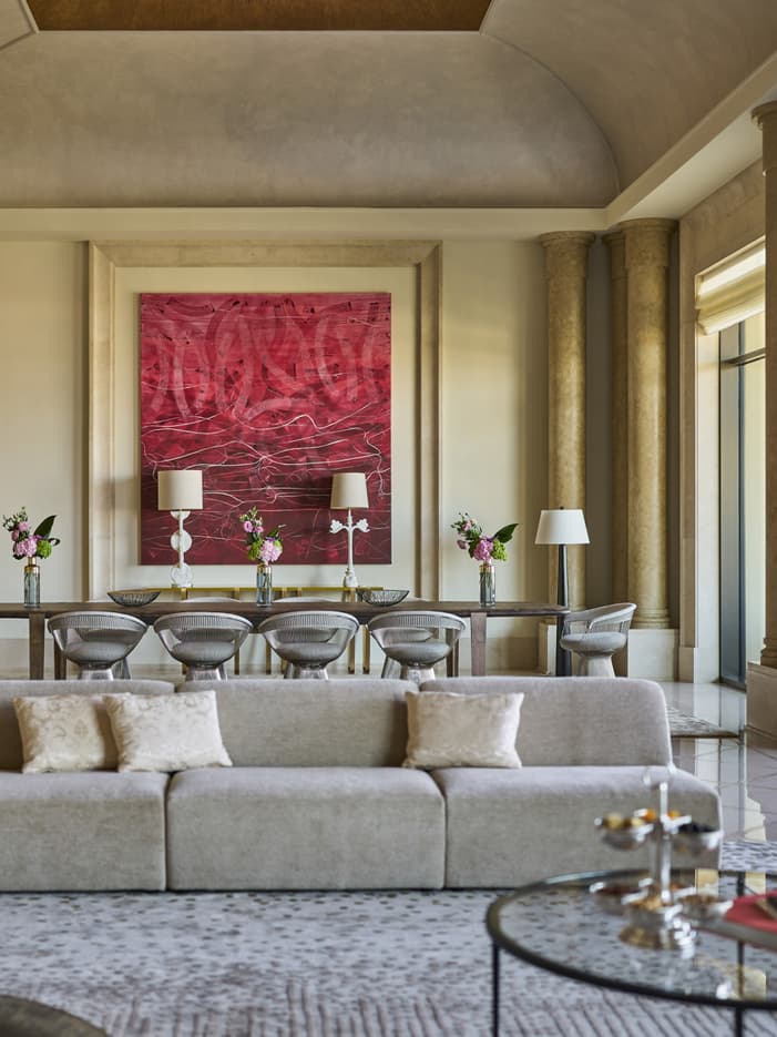 A private elevator takes you up to the penthouse floor and our grandest suite. Bright and airy rooms with marble floors, towering columns and streams of natural light are contrasted with the intimate elegance of the wood panelling and cozy furnishings in the study and media room.