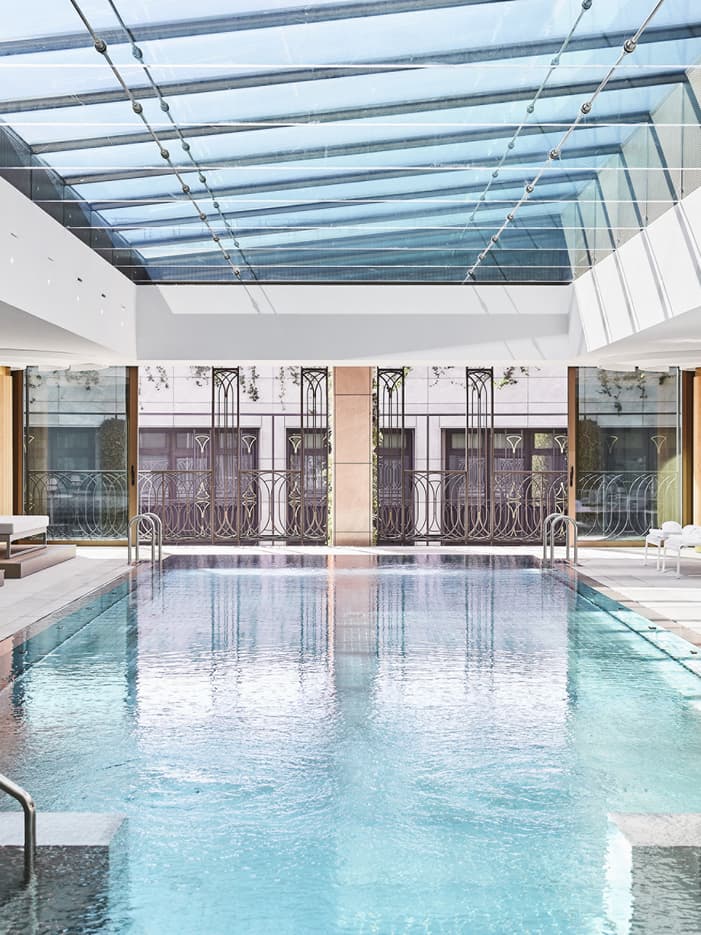 COMO UN RESORT SECRETO EN LA AZOTEAEncuentre tranquilidad en nuestra piscina interior de 14 metros (46 pies) y en la soleada terraza de la octava planta, que ofrece vistas sobre los tejados de Madrid y las colinas ondulantes a lo lejos. Las modernas paredes de cristal y un tragaluz del tamaño de la piscina crean un entorno con abundante luz natural. Relájese y continúe con una experiencia cálida y meditativa en nuestra sauna y sala de vapor.