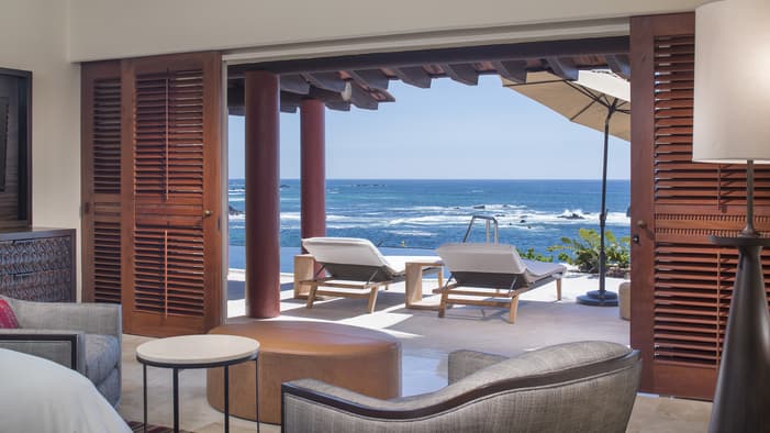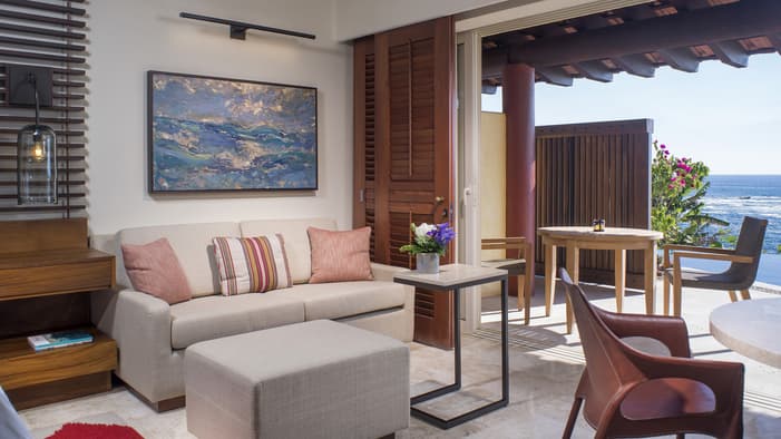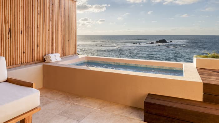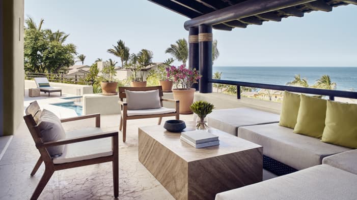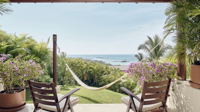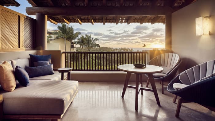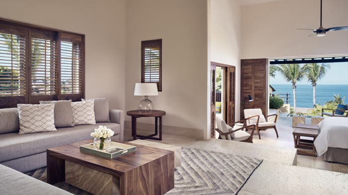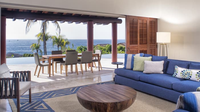 Nuestras casitas de estilo mexicano moderno cerca de Puerto Vallarta ofrecen acogedoras áreas de descanso y terrazas privadas con vistas a exuberantes jardines tropicales o al Pacífico.