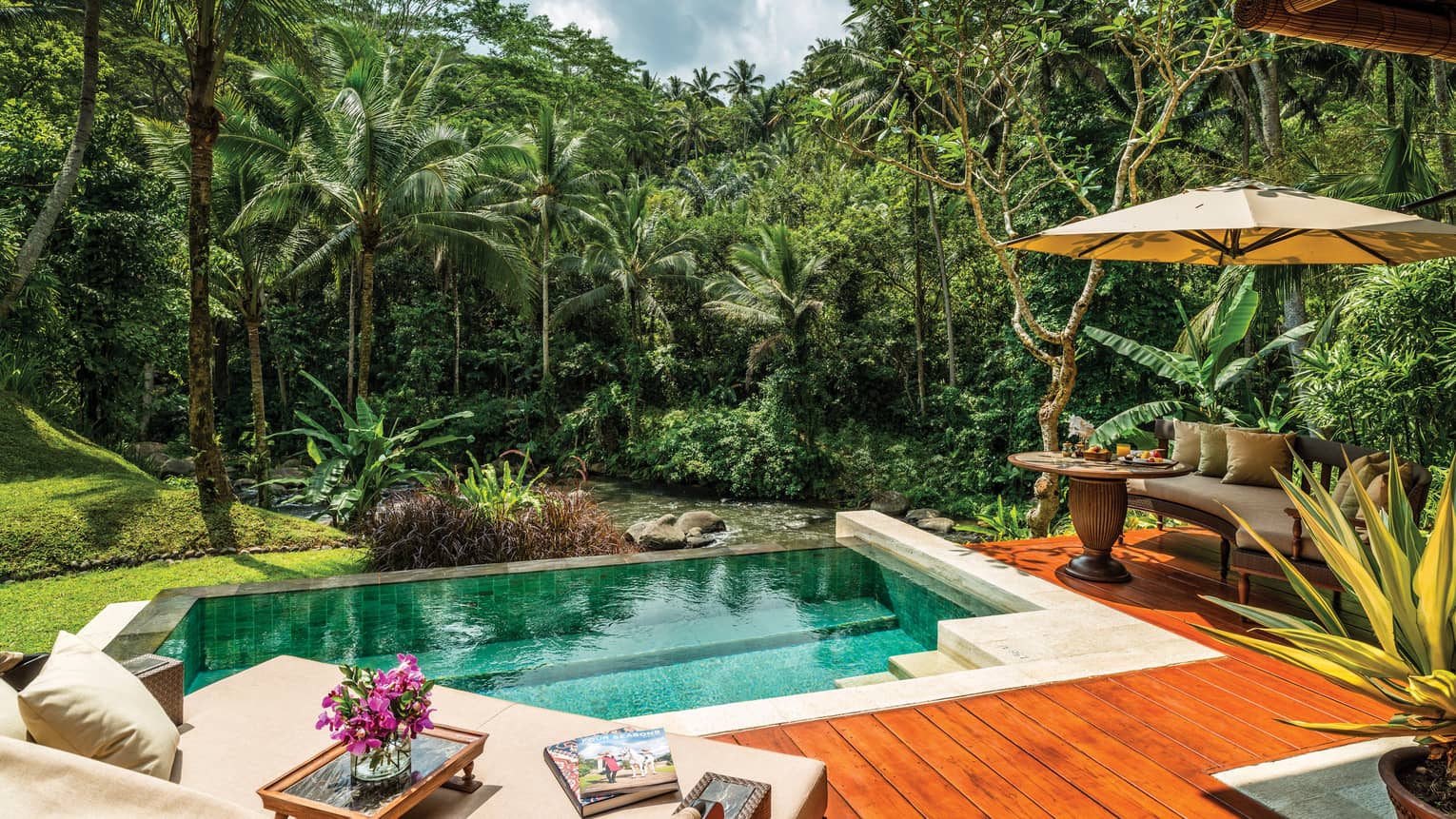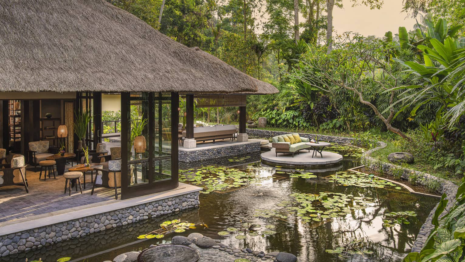 Prepare to be awe-struck as you enter the property along a narrow footbridge to a rooftop infinity lotus pool, designed in the shape of a rice bowl, an offering to the gods. Floating above the treetops, enjoy 180-degree views of lush jungle and the sacred Ayung river below. Blurring the lines between indoors and out, your luxury riverside villa boasts a private pool, authentic carved-wood finishes, and stunning views of green hillsides and rice terraces.