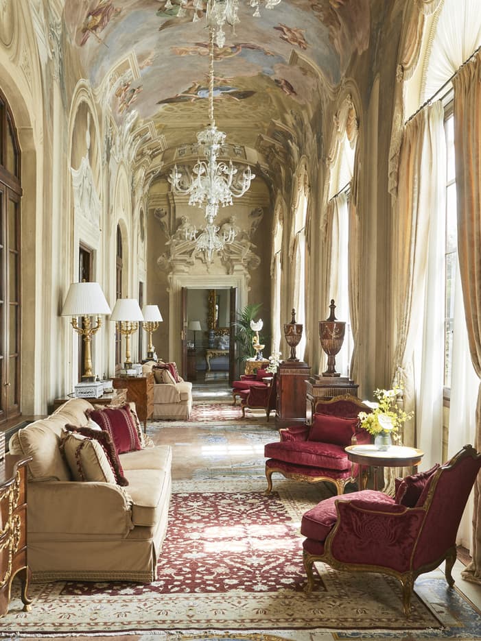 With painted vaulted ceilings above, original Capodimonte Maioliche-style ceramic floors below, and 17th-century frescoes framing views of the park, this suite – once the nobles’ quarters at Palazzo della Gherardesca – offers an endless visual dream.