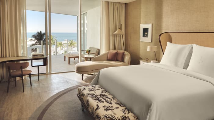 Take in scenic ocean views through floor-to-ceiling windows with sliding glass doors. Enjoy an indoor-outdoor lifestyle, flowing from the sleek retro-elegant interiors to the spacious balcony with a dining table for two.