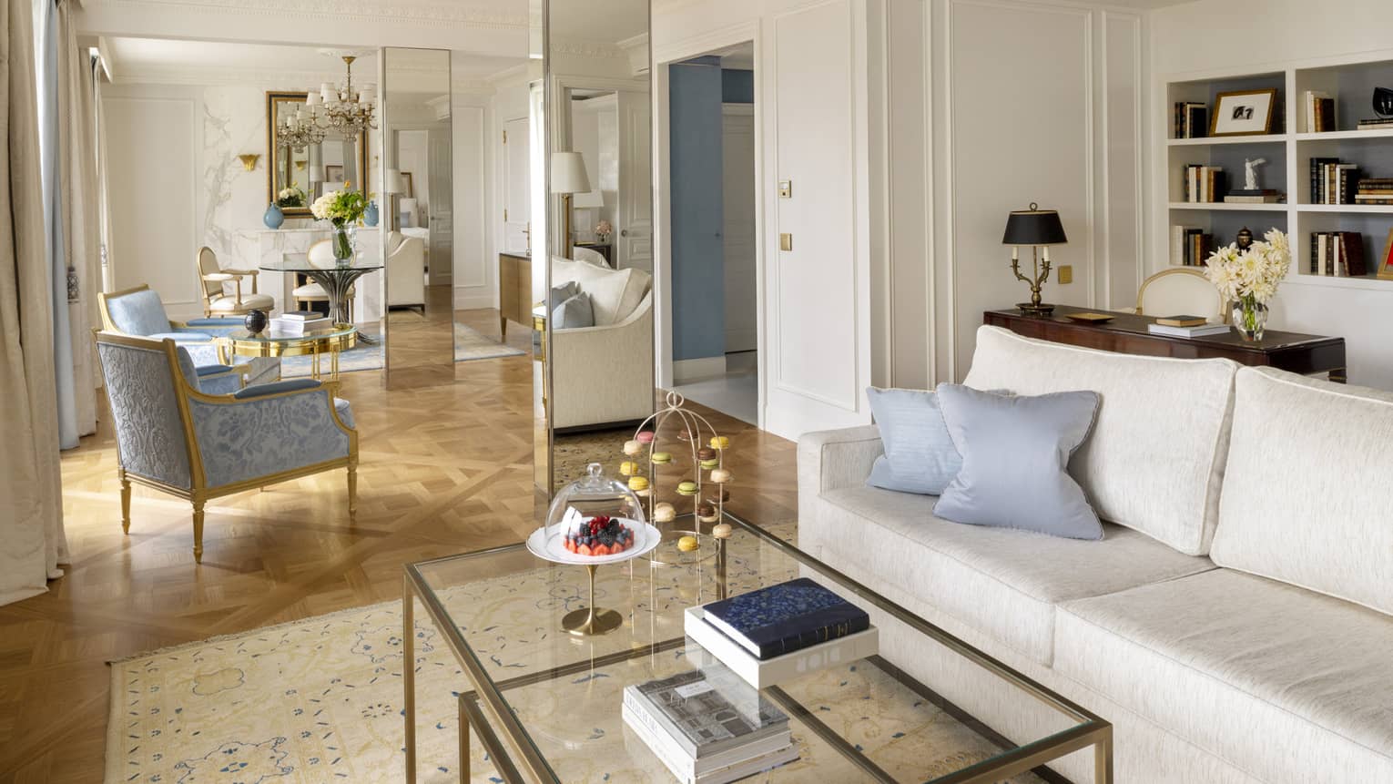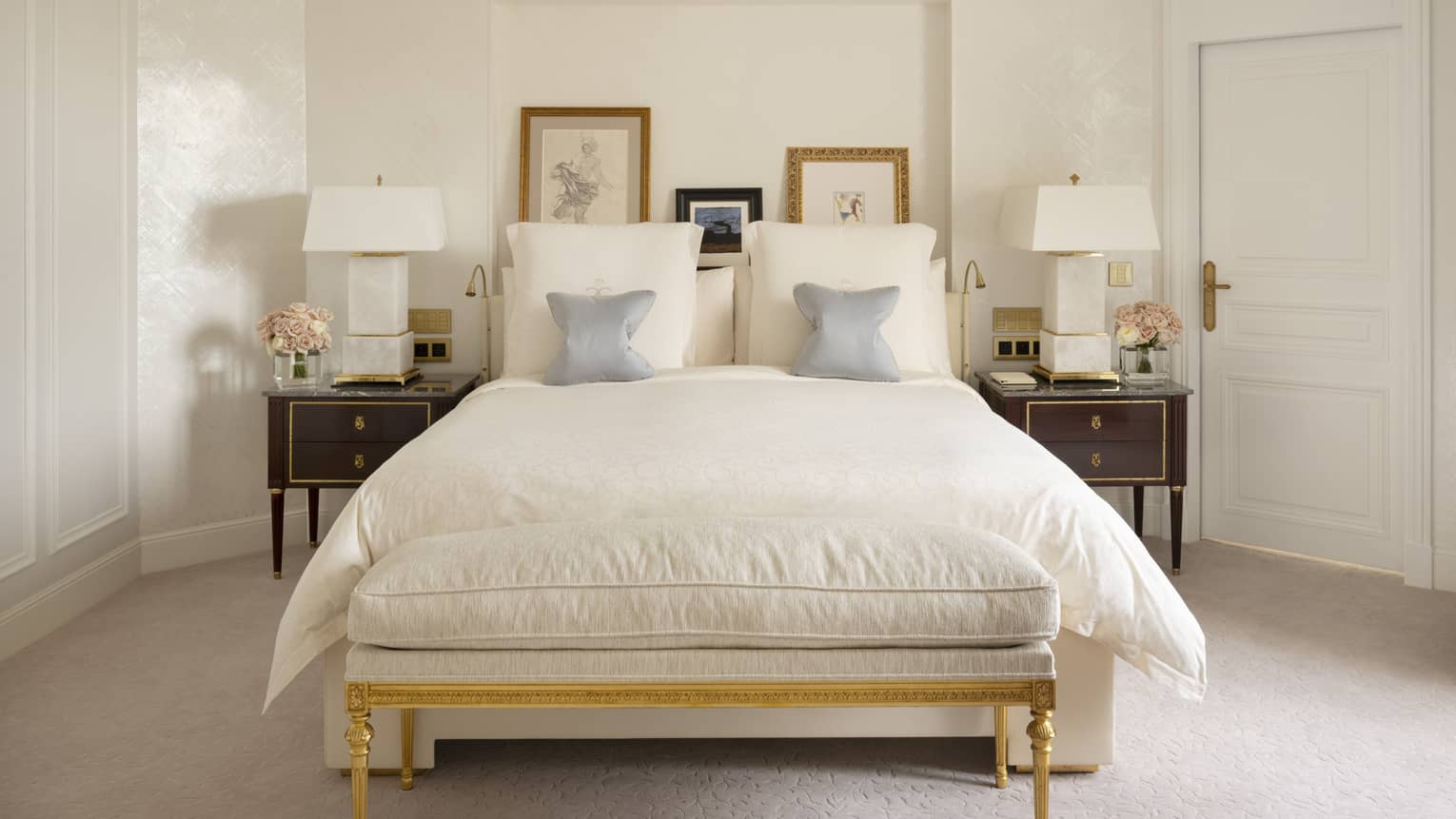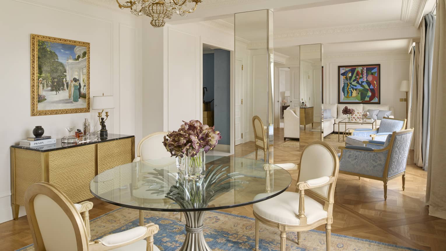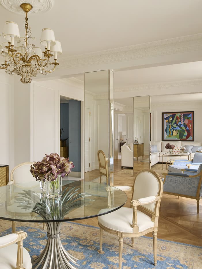 Ces suites au décor raffiné recréent le charme d’un grand appartement parisien, dans un cadre alliant glamour à la française et luxe contemporain. Des œuvres d’art de style classique ou Empire ornent l’intérieur tandis que leur balcon intimiste offre une vue magnifique sur la cour en marbre de l’hôtel.