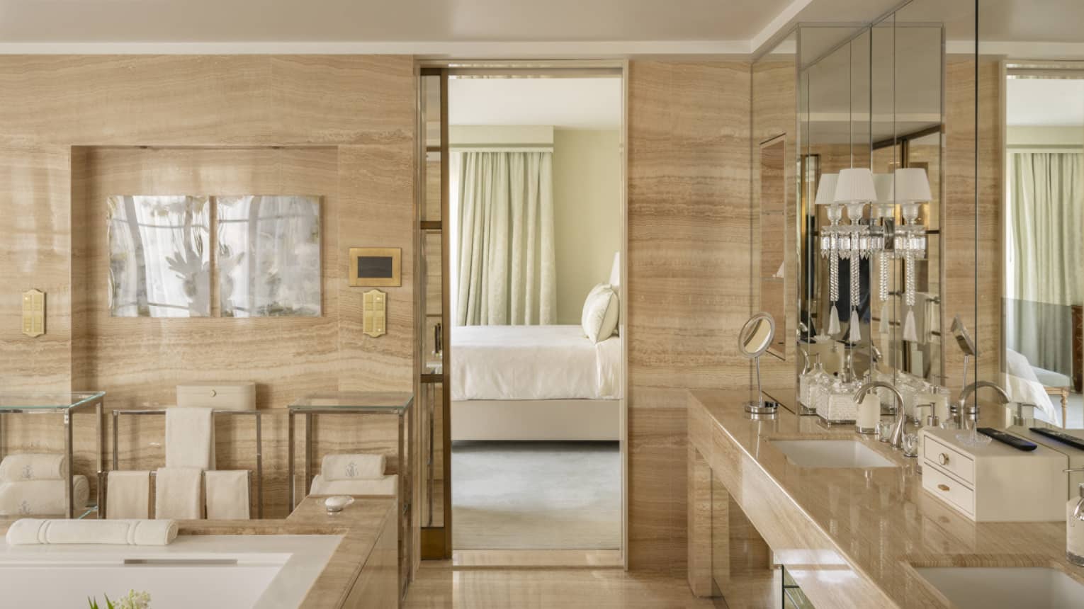 Spacieuse et particulièrement accueillante, cette suite dispose d'un sol en travertin et de murs ornés de Majilite et de sycomore
