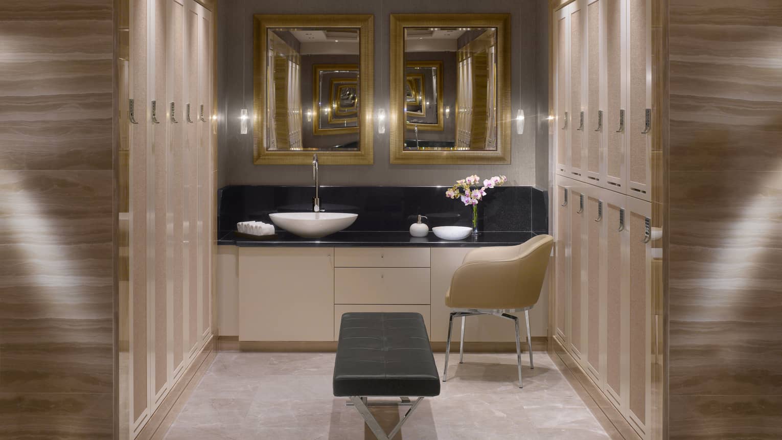 - Luxurious changing areas feature private bays with spacious lockers. Each bay has been designed for maximum privacy and features a wet and dry vanity area offering full amenity sets, oversize lockers and rest rooms.