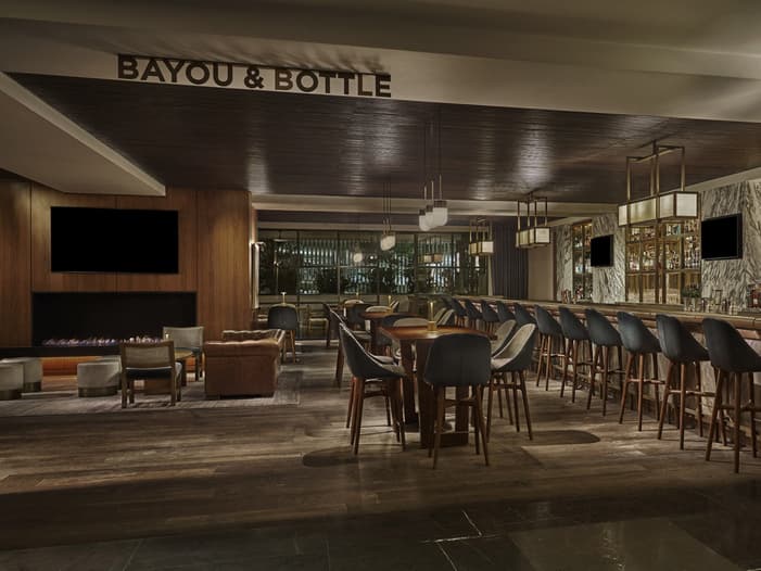 Coffee service, pastries and a select to-go menu for breakfast and lunch is available at the grab-and-go (or stay) counter within Bayou & Bottle.