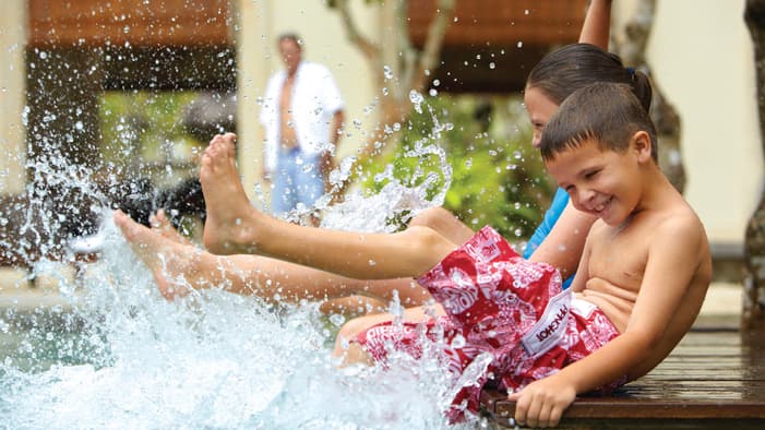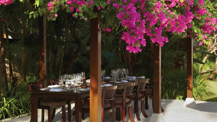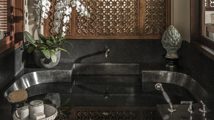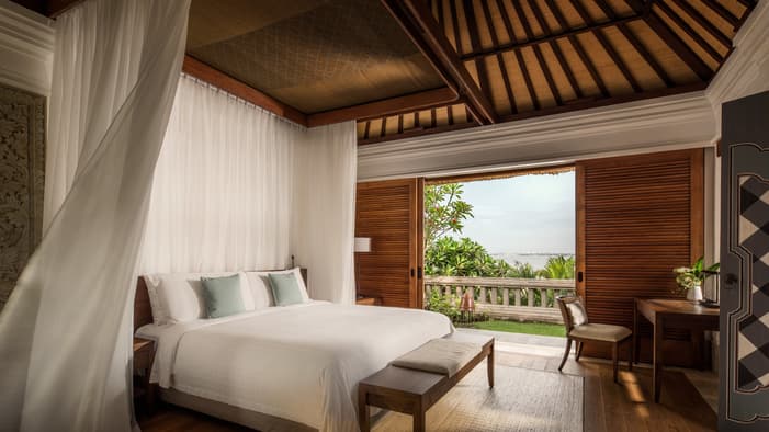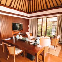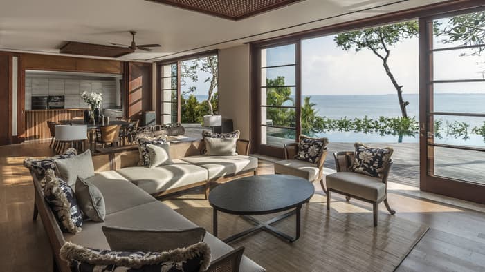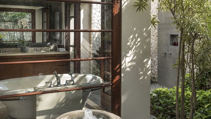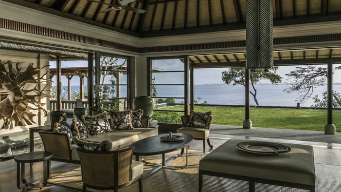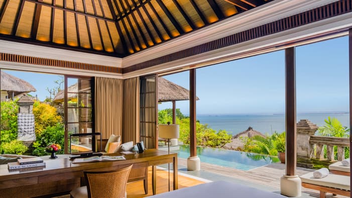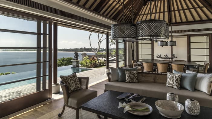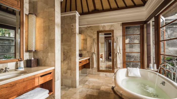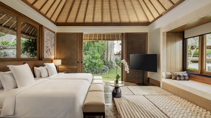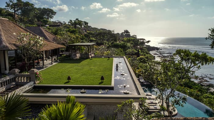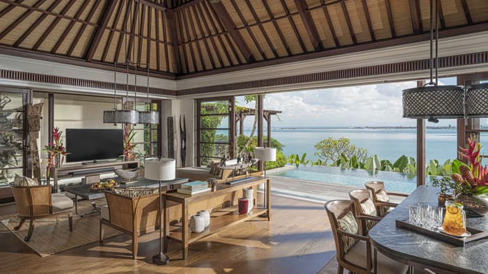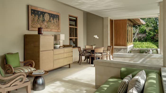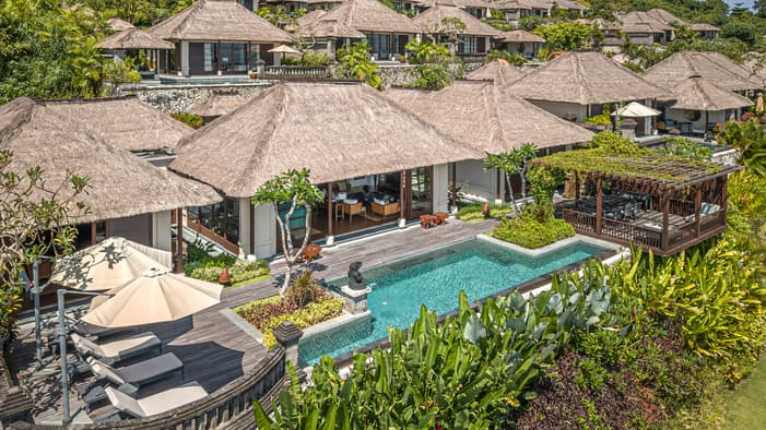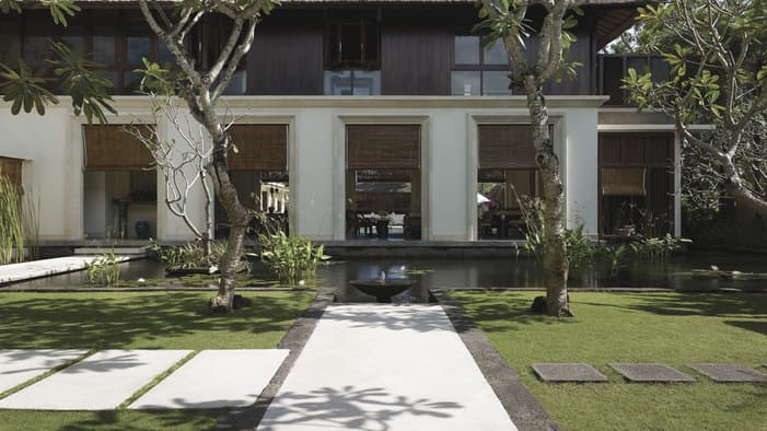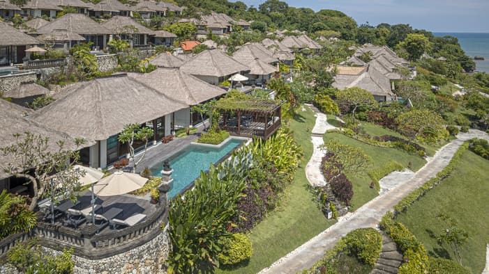 Inspired by traditional Balinese architecture, the Resort’s 147 villas and nine residences are housed within a private stone-walled courtyard featuring separate thatched-roof pavilions.