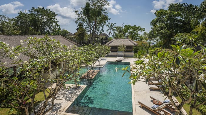 Inspired by traditional Balinese architecture, our luxury Bali beachfront villas are housed in a private stone-walled courtyard featuring separate thatched-roof pavilions. Each villa offer spacious indoor and outdoor living areas, lush gardens, a private pool and glittering blue views from a sun terrace.