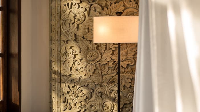 Local materials like the lampit and ikat fabric, thatched roofing, as well as the wooden flooring imbue a sense of place, while our famous master carver Made Jojol's wall panels add an elegant touch of Bali.