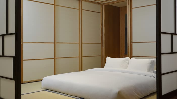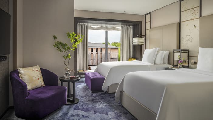 和紙の照明や襖、漆器が和の趣を添える洗練されたゲストルーム。京都市街や日本庭園「積翠園」、コートヤードの景色を大きな窓から眺めながら、心安らぐ京都のホテルステイをお楽しみいただけます。