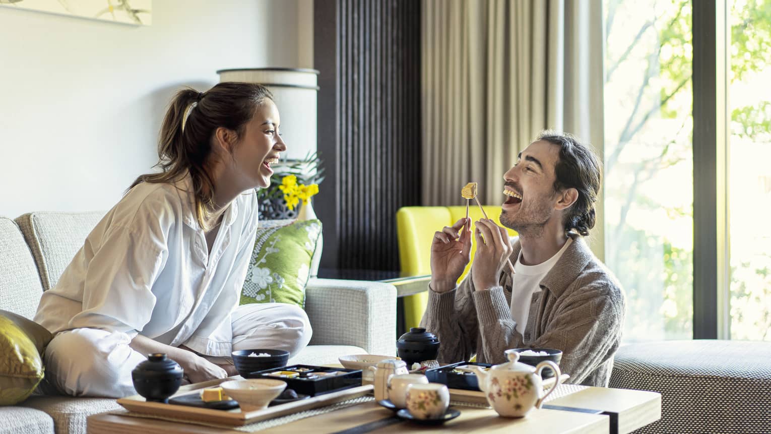 レストランの味を、時間やシーンに合わせて客室で愉しめるインルームダイニング。朝食からディナーまで、タブレットひとつで24時間ご利用いただけます。ご家族の団らんにも、プライベートなひとときにも寄り添う、心地よいお食事体験をお届けします。