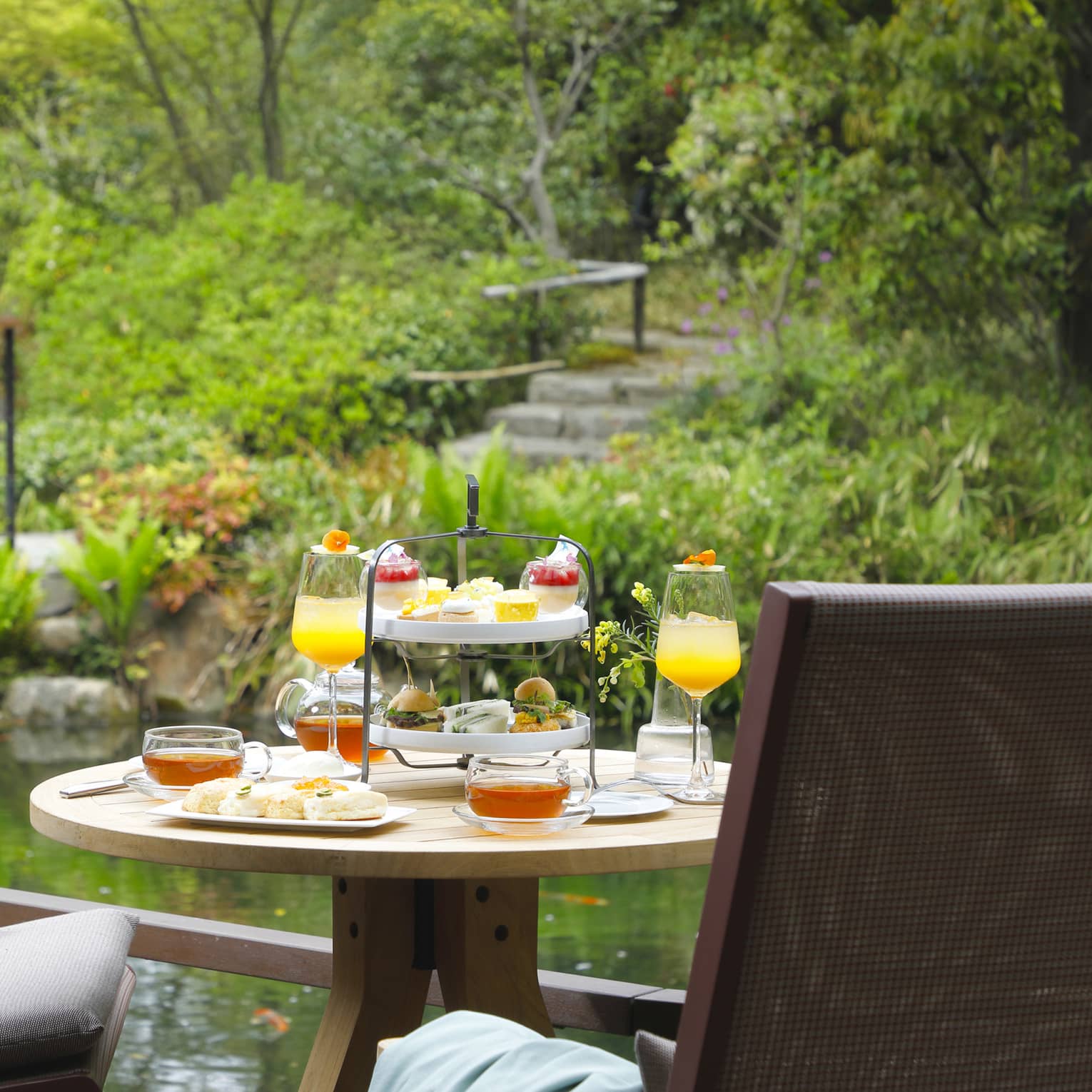 静寂に包まれた800年の池庭を眺めながら、ゆったりとしたアフタヌーンティーをお愉しみください。時を超えた自然の美しさと、洗練された心地よさが調和する空間で、繊細なスイーツとセイボリーをご堪能いただけます。